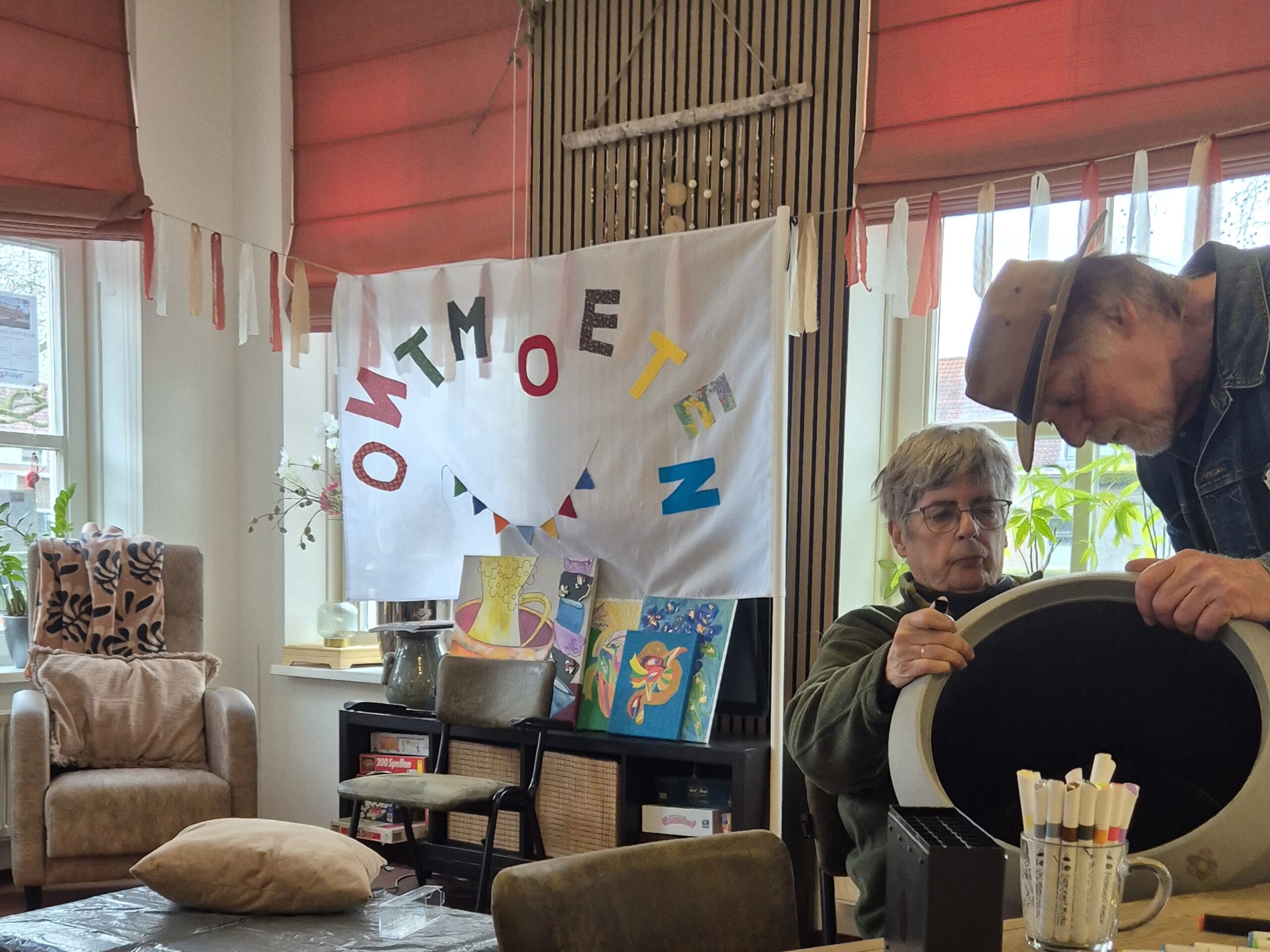 In onze buurthuiskamer De Buurvrouw Zoutman in Gouda is van harte lust gekleurd, geknipt en geplakt om de buitengevel van het pand zomerklaar te maken. De Buurvrouw Zoutman is een ontmoetingsplek voor mensen met lichte geheugenproblemen, cognitieve achteruitgang, dementie. Iedereen is welkom, voor een gezellig praatje, een leuke activiteit of een zinvolle dagbesteding.