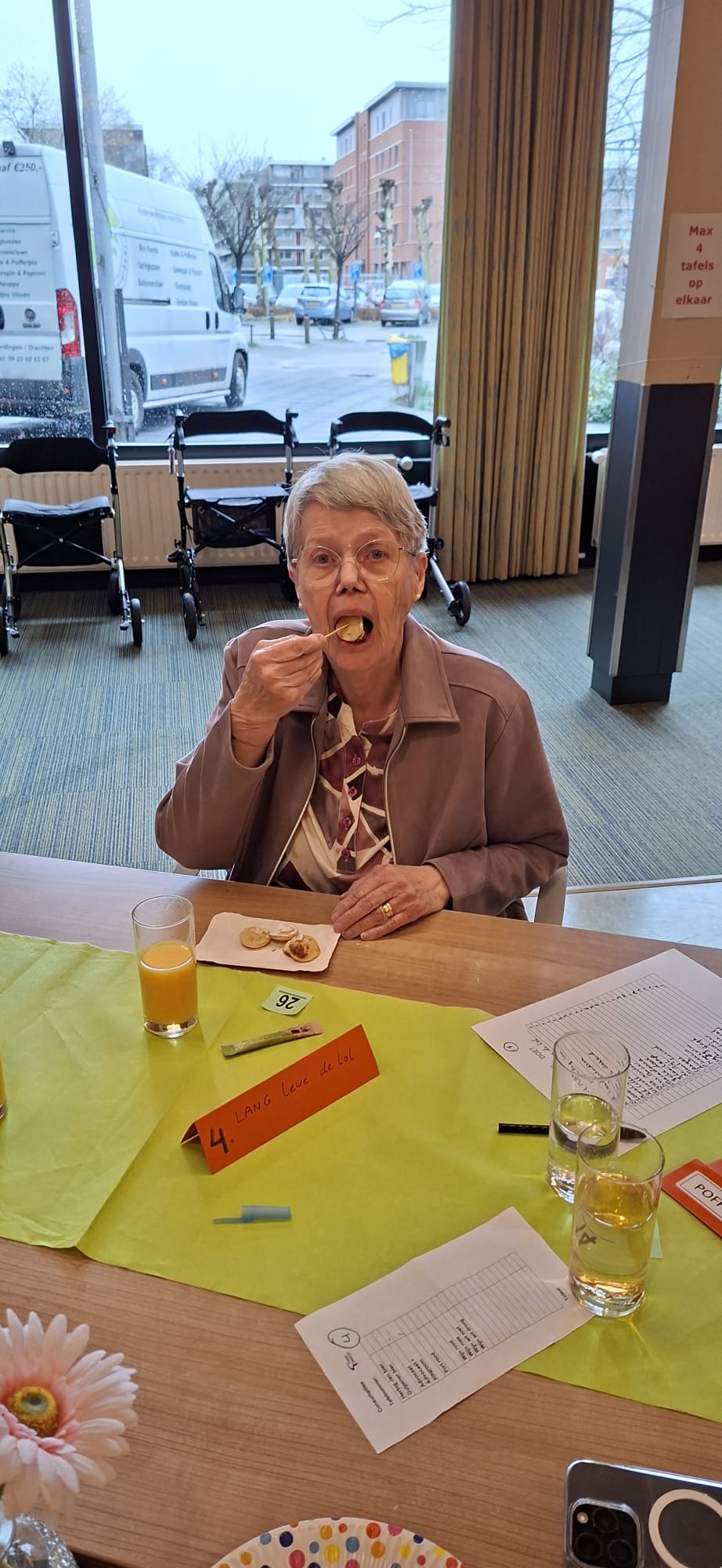 In het Anne Frank Centrum in Waddinxveen hebben we met hulp van een heleboel lokale vrijwilligers een feestelijke vrijdag neergezet. De ochtend startte met koffie en versierde cupcakes. Zodra alle 50 deelnemers binnen waren, startte een heuze pubquiz onder leiding van vrijwilligers van Con Vigor. De winnaars van de pubquiz gingen naar huis met een cadeaubon, beschikbaar gesteld door ondernemersvereniging van Waddinxveen. Maar niet alleen met de pubquiz vielen prijzen te winnen! Ook het Rad van Fortuin was deze ochtend aanwezig in het Anne Frank Centrum. Er zijn diverse prijzen van ruim 20 winkeliers uit Waddinxveen verloot. Om 11 uur opende de poffertjeskraam van Sietze van Sprinkhaan Verhuur, kon iedereen genieten van onbeperkt poffertjes eten en daarna weer met een gevulde maag huiswaarts. “Wij kijken terug op een zeer geslaagde ochtend en willen graag de vrijwilligers van alle bedrijven bedanken voor hun bijdrage.”, vertelt onze activiteitencoach Miranda.